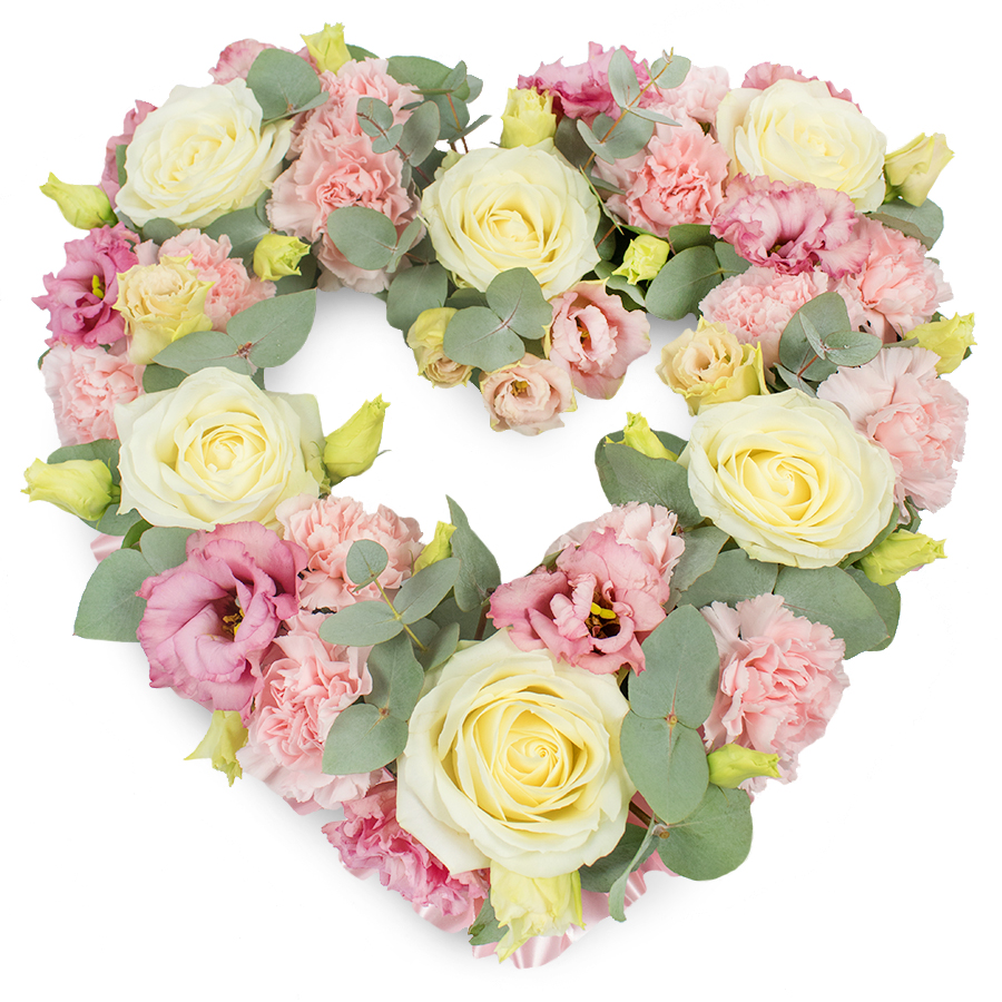 Show your deepest appreciation with our Sophisticated Open Heart Tribute. This elegant bouquet features a refined combination of white roses, pink carnations, pink lisianthus, and eucalyptus, meticulously arranged in an open heart shape to symbolize enduring love.